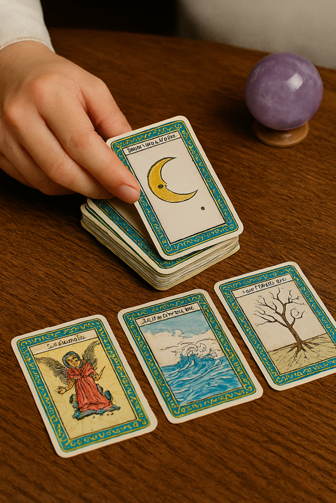 - L’oracle est mélangé et les cartes sont tirées selon un ressenti ou un tirage spécifique